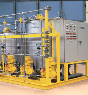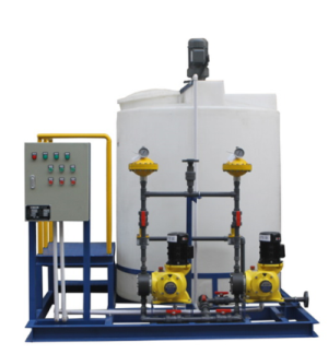 循環(huán)冷卻水加藥系統(tǒng),根據(jù)循環(huán)冷卻水的濃縮倍數(shù),通過電導(dǎo)率儀檢測循環(huán)冷卻的電導(dǎo)率(指標(biāo)為水的含鹽量)達(dá)到一定數(shù)值后,控制電磁閥打開,循環(huán)冷卻水系統(tǒng)開始排放污水,在排放污水的同時向水中補(bǔ)加新鮮的水,同時向水中投加緩蝕阻垢劑(其投加濃度根據(jù)水質(zhì)和緩蝕阻垢劑的種類)。由于循環(huán)冷卻水的堿度偏高,可以通過自動加酸裝置調(diào)節(jié)其PH值。通過向水中比例投加殺菌滅藻劑,控制循環(huán)冷卻水的細(xì)菌和粘泥的增長。